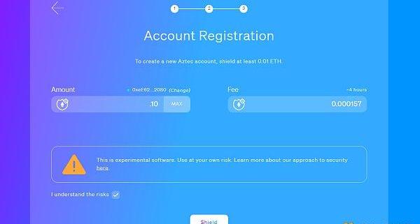 ?4)接下来,你将输入想要为你的Aztec账户提供资金的ETH金额,确认你是否了解风险,然后按下“Shield”。