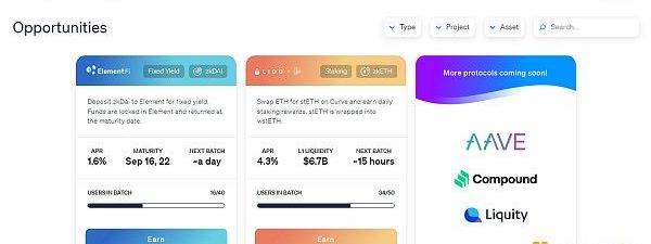 2)查看可用机会,目前在ElementFi储存zkDAI或在Lido质押stETH收益率都是固定的,然后点击期待已久的Earn按钮。