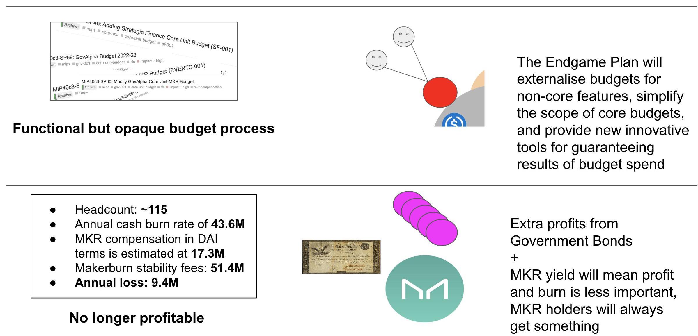 现有治理流程一方面过于复杂,制约了MakerDAO开发新功能的速度;另一方面需要依靠庞大人力的参与,这就成了导致MakerDAO在熊市中亏损的主要原因。作为终局计划的重要组成部分,MetaDAO就致力于加快治理进程、减少MakerDAO的人力成本,隔离风险、并行化高度复杂的治理流程。