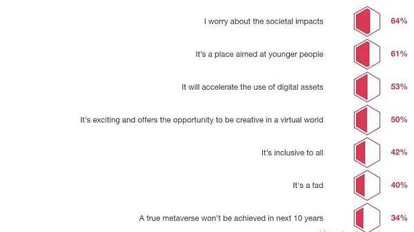 虽然这些数字看起来令人印象深刻,但重要的是要记住,元宇宙的"终极"版本还不存在。一些元宇宙元素正在进入日常商业活动,但我们仍处于早期阶段。消费者对元宇宙这个概念感到兴奋,但他们的忠诚度还有待于提高。只有9%的人说他们目前使用任何现有的环境,企业领导人和消费者对于元宇宙的描述的差异非常大。