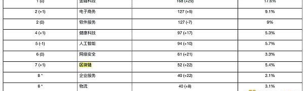 本次榜单中,区块链行业排名上升一位至第七,有52家独角兽上榜,相比去年增加了22家,总价值1.5万亿元,占全球独角兽总价值的5%。