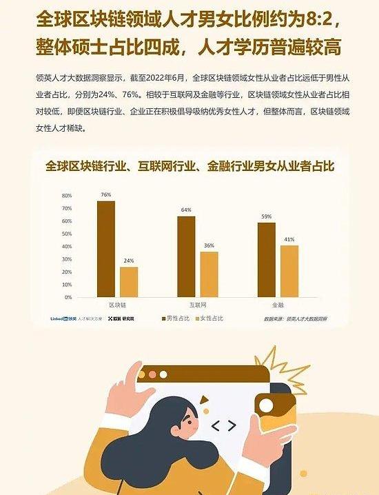 区块链企业对人才的学历要求正在提高,且女性人才稀缺。全球区块链领域人才男女比例约为8:2,硕士人才占四成,整体学历水平相对较高,且专业性越强的岗位学历要求越高,随着区块链行业整体的创新发展以及全球部分高校陆续开设与区块链相关的学科或课程培养专业人才,人才学历要求将进一步提高,人才竞争将更为激烈。