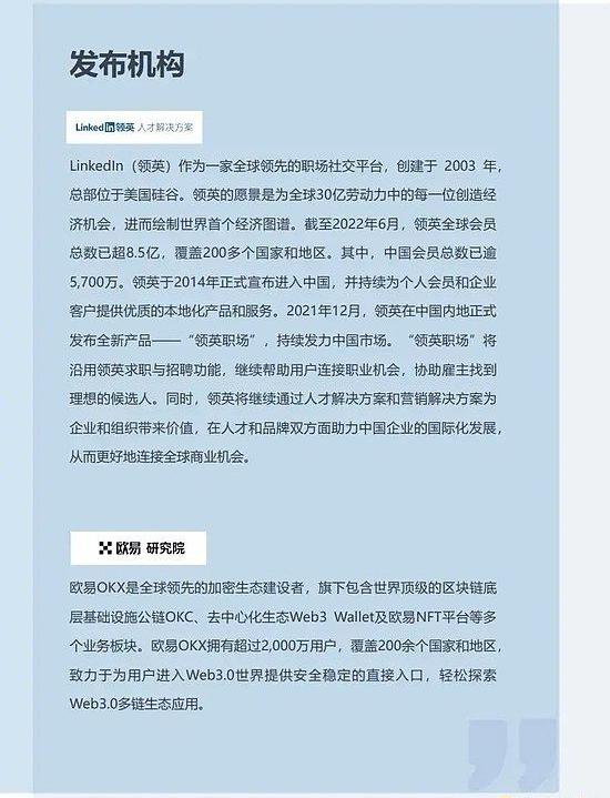 欧易OKX&领英正式发布全球首份《2022全球区块链领域人才报告-Web3.0方向》,报告全文近2万字,耗时近3个月,数据样本覆盖180个国家,囊括了全球区块链行业概览,人才现状以及人才发展趋势与建议三大板块。