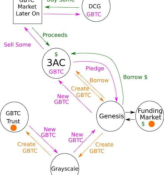 DCG拥有Grayscale和Genesis,Grayscale发行了GBTC基金,他们拼命想把它变成ETF;而Genesis提供借贷服务,其中包括BTC和GBTC以及美元的借贷。