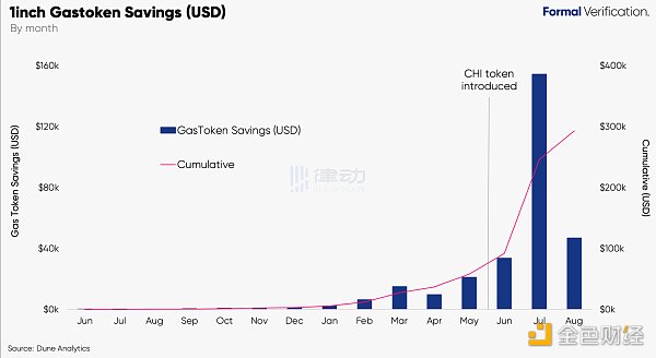 迄今为止,1inch 用户通过使用 GST2 和 CHI 已经总共节省 30 万美元,其中自从 CHI(6 月起)推出以来,节省的最多。7 月用户总共节省了 15.4 万美元。在此需要特别注意的是,从 6 月开始,为用户节省的费用可能原因是 CHI 架构设计的改进以及大众更广泛地采用 1inch 聚合交易平台。