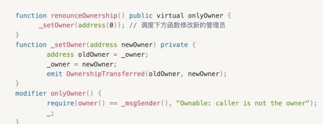 放弃所有权执行的是renounceOwnership方法,会将_owner设置0地址,而这样一来整个合约中,被用onlyOwner修饰过的方法均将无法调度使用了
