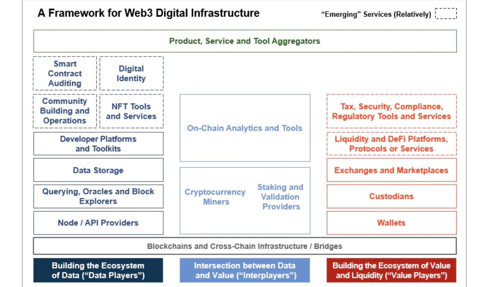 “Interplayers”和支持区块链的基础设施:我们已经强调,Web3的核心租户是区块链技术允许的价值和数据的结合。因此,有支持区块链计算层的基础设施,这推动了价值和数据服务获得成功的能力。