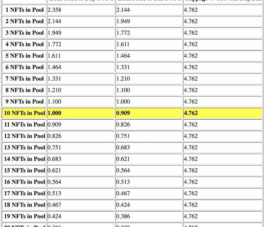 x*y=k池子中,交易者每购买或出售一个NFT时所需的ETH