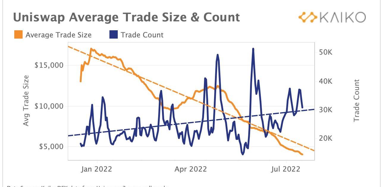 交易费用的下降正是以太坊所需要的,但在当前的这种情况下,主要是与需求不足有关。DeFi项目的TVL暴跌,NFT处于有史以来的第一个熊市,所有这些都使区块空间需求降至低点。然而,低费用确实让我们看到,如果费用不那么高,以太坊用户在未来可能会与协议互动。随着今年DEX交易量的逐步减少,人们认为这才描绘了这些平台的真实用户情况,然而,一个有趣的趋势是交易笔数,它显示了一个交易所的实际使用情况,交易规模展示的是鲸鱼与零售活动。以Uniswap和Curve为例,它们是以太坊交易量最大的两个去中心化交易所,用户是否根据较低的费用调整了自己的行为?答案是肯定的。
