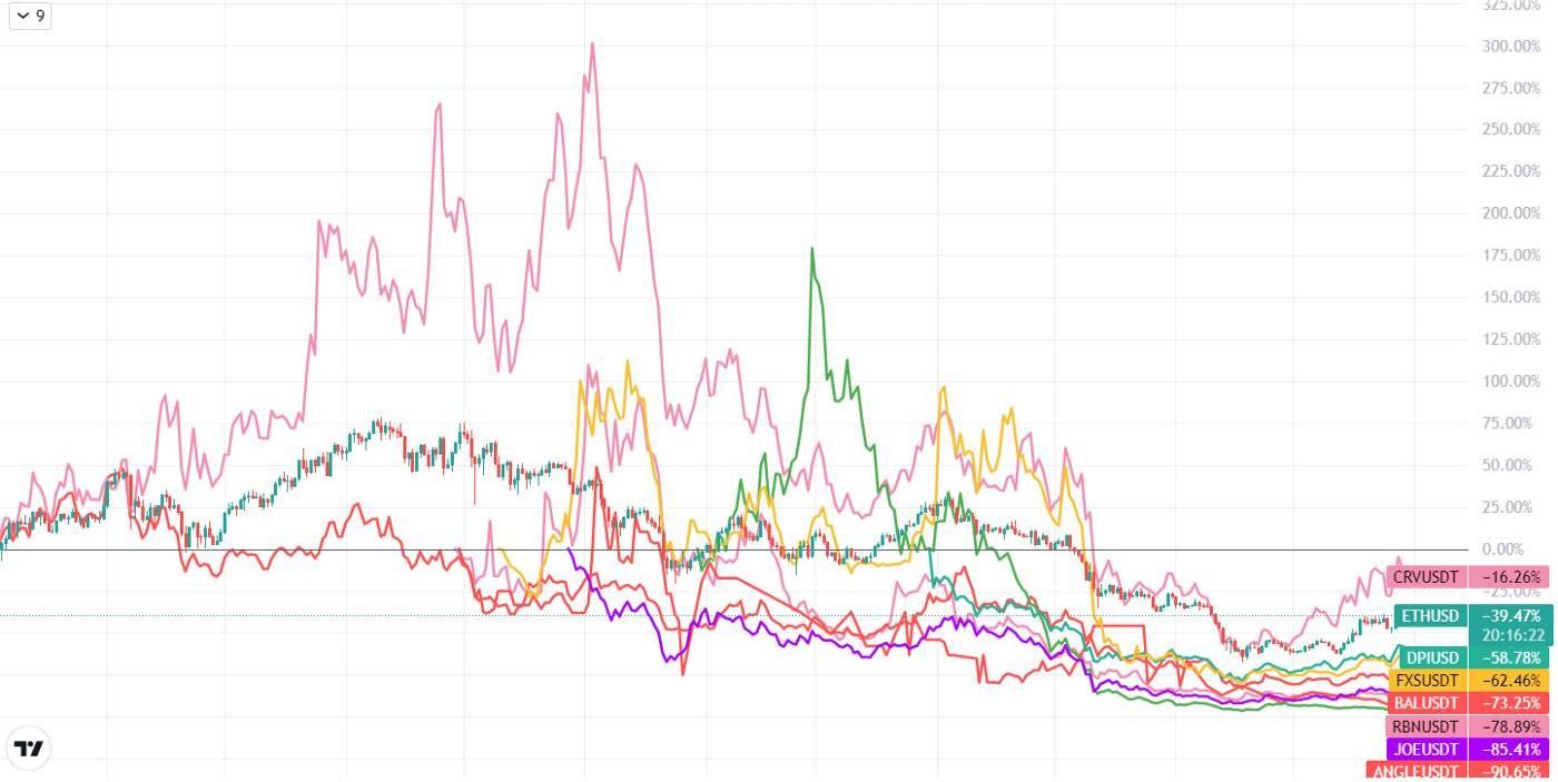 这些DeFi代币的价格暴跌。存款收益率下降,LP离开。这是一个死亡螺旋。