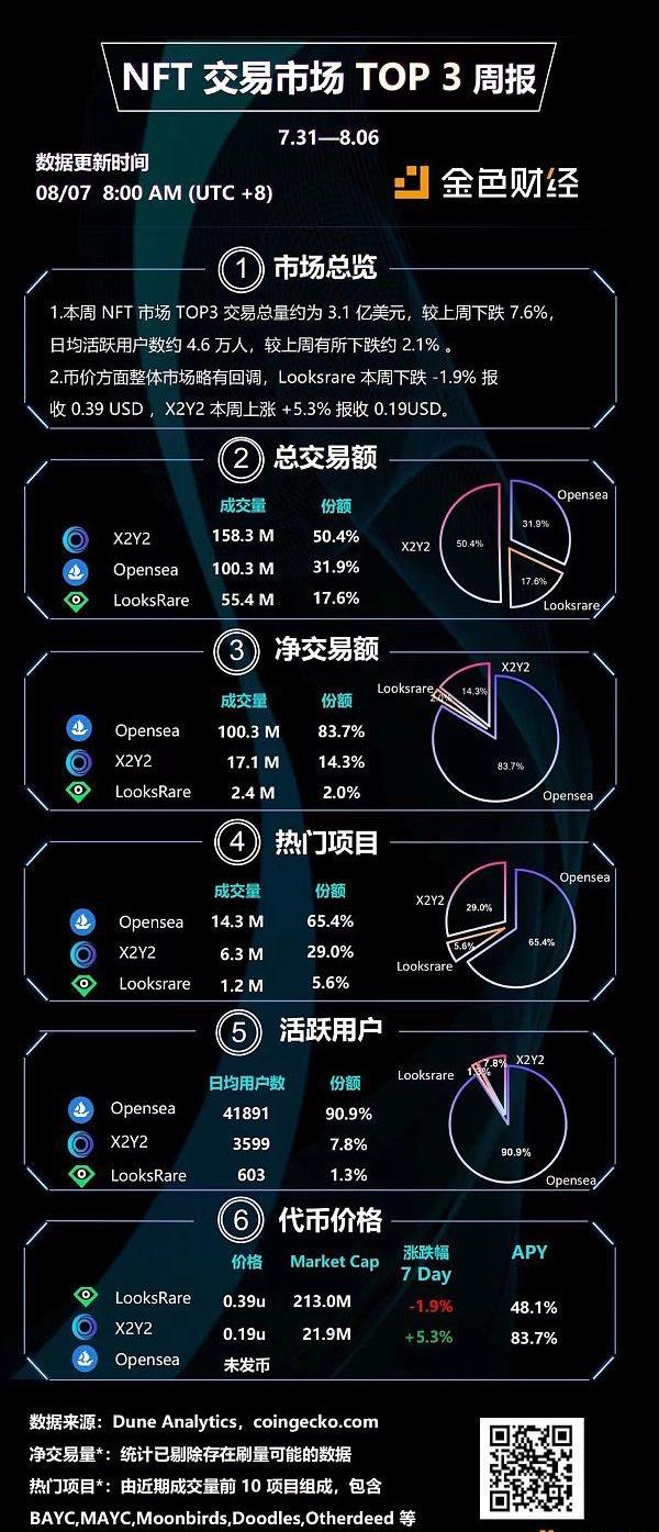1、上周NFT市场成交量稳中有降,较上周下降约7.6%;其中X2Y2周成交额持续位居榜首,份额占比50.4%。