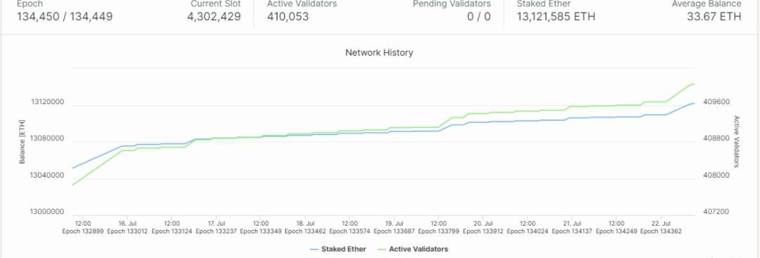 在信标链方面,目前验证者数量已经超过41万个,ETH质押数量超过1310万个,占到总供应量的约11%。从上线至今,信标链一直稳定运行,信标链已经为合并做好准备。