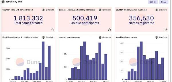 7月还没有结束,在以太坊域名服务平台ENS上,有326800个以「.eth」结尾的域名在这个月内被注册。DuneAnalytics数据显示,7月的注册量截至目前仅次于今年5月的365652个,而ENS域名的创建总数已超过181.33万个,参与注册的独立地址数超50.04万个。