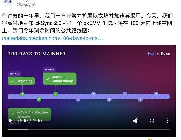 zkSync建设者MatterLabs透露,zkSync2.0是一个基于zkEVM的?ZKRollup,“将在100天内上线主网上。”