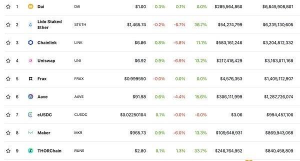 DeFi项目锁定资产前十排名及锁仓量数据来源:defillama