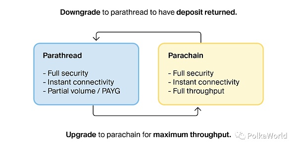专用的平行链插槽提供了高吞吐量,但需要长达两年比较大额的保证金。那为什么需要这样做呢?因为共享安全不是免费安全,平行链是这种安全性和使用波卡吞吐量的纽带。平行线程具有与平行链完全相同的 API 和功能,但是是基于 “按需付费” 的方式。