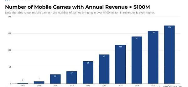 目前游戏作为数字时代人们娱乐的最主要方式之一,正在创造极大的产值,在2021年,其中光是超过1亿美元年收入的手机游戏就达到174个。
