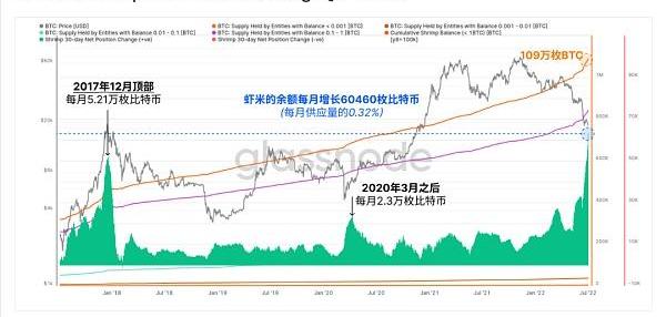 深入研究,我们可以看到,虾米们正在以每月60460枚比特币的速度增加他们的余额,创造了历史上最积极进取的速度。这相当于每月流通供应量的0.32%。有趣的是,虾类余额扩张的速度超过了2017年12月历史前高时创下的记录,当时的价格也在2万美元。
