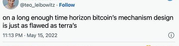 “在足够长的时间范围内,比特币的机制设计与Terra的一样有缺陷。”