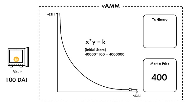 (2)Perpetual协议将来自Alice的1,000 vDAI(100 DAI的10倍杠杠)记入vAMM,vAMM根据一个恒定乘积函数(x*y=k)计算Alice收到的vETH数量。