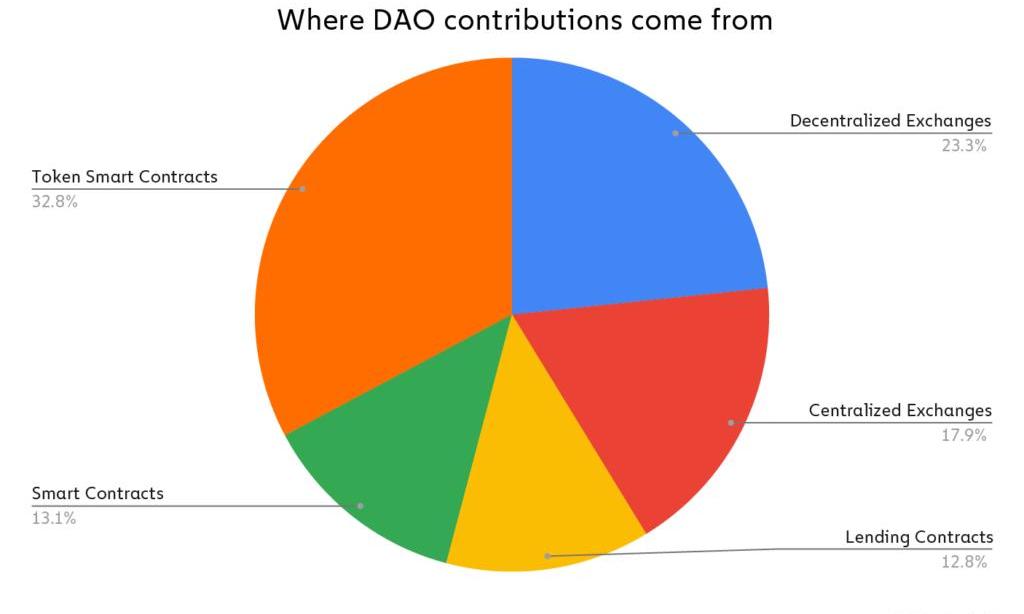 正如所料,DAO参与者是加密货币服务的高级用户。DAO国库资金中只有17.9%来自中心化服务,其余82.1%来自去中心化服务。这表明大多数DAO贡献者也使用了DeFi平台来托管他们的加密货币。