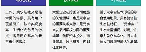 核心层包括工作、社交和娱乐。技术层包括商业、场景体验和疾病治疗。而环境层包括虚拟人物、教育、旅游生态和国际传播。