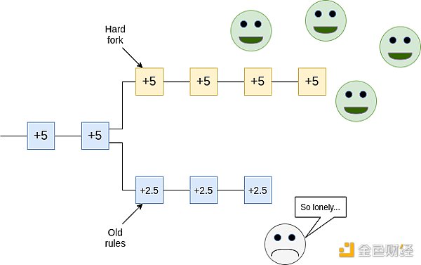 请注意,这种推理与我们经常听到的另一种推理方式截然不同:“根据定义”,更改规则的那条链在某种程度上其实并不是正确的链,无论有多少其他用户接受某些新规则,重要的是你依然可以留在自己喜欢的且遵循旧规则的那条链。