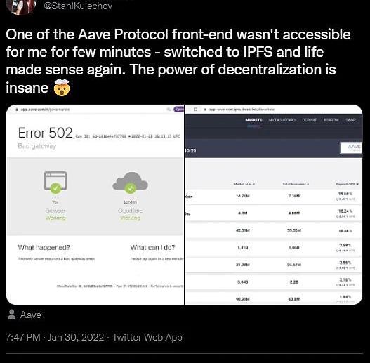 去中心化存储降低了服务器故障、DNS黑客攻击或中心化实体移除对dApp前端的访问权限的可能性。即使dApp的开发停止,前端和通过该前端访问智能合约的权限也可以继续存在。