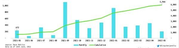 如果只看NFTFi(NFT信贷市场的行业领导者)发放的贷款,2021年贷款规模超过4000万美元,2022年1月至2022年5月的累计贷款规模达到1.55亿美元。2022年5月NFT交易额30亿美元(见图2),NFTFi同月发放3600万美元贷款,NFT信贷市场渗透率略高于1%。