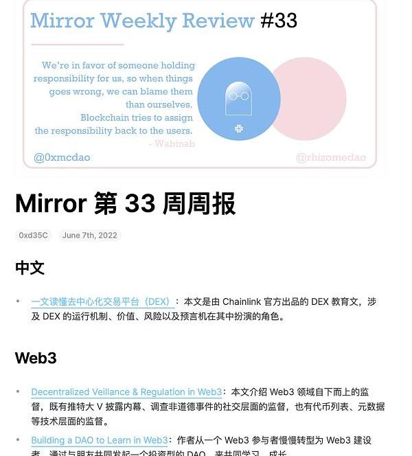 MirrorWeeklyReview目前就是一个团队的产品,目前已经进行了34期。它由MCDAO运营,致力于精选、点评、传播Mirror.xyz上高质量内容及创作者,帮助读者快速了解Mirror平台创作者的精彩观点。