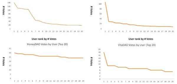关于这些集体是否事实上存在等级现象,投票记录本身并没有揭示,但MetaCartel、LAO和VitaDAO统计结果中的数据偏离表明,除了少数投票频繁的参与者之外,还有相当多的社区成员表现冷漠。少数成员对投票怀有强烈兴趣,而其余人却常常故意拖延──这样的环境不利于平等参与,也为少数人创造了制定行动和政策的机会。