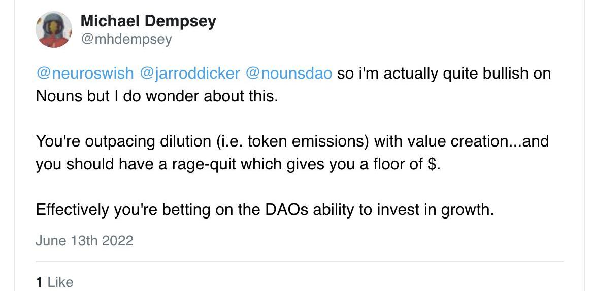 所以我实际上很看好Nouns,但我确实想知道这一点。你在创造价值方面超过了价值稀释......你应该愤怒地退出,这会给你一个地板价。实际上,您是在押注DAO投资增长的能力。