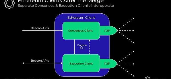 客户端收到信标链区块,执行客户端运行交易,如果一切顺利共识客户端将遵循该链。所有的客户端都是可互操作的,你将能够混合或匹配你所选择的执行客户端和共识客户端。一个新的用于客户端之间通信的引擎API将被引入: