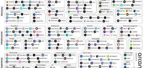 ArcaneResearch是一家研究机构,建立了自己的Web3Database,跟踪了近500个Web3项目。Arcane并没有从技术堆栈角度来概括Web3全景图,而是从基础设施、可体验Web3应用和新应用探索三个层面来展示Web3生态全景图。