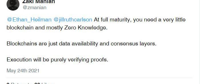 区块链利用ZKP来解决这个问题。整个交易历史可以压缩到一个单一的证明,只需要验证证明,而不需要验证整个账本。该证明的尺寸不会超过几条推文,任何人的硬件设备都可以完成。