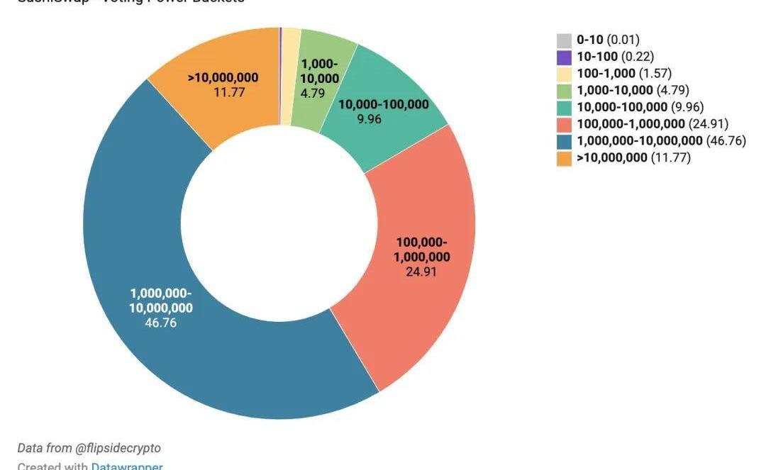 100万以下的钱包在SUSHI中拥有41.5%的投票权,而Uniswap只有5.3%。