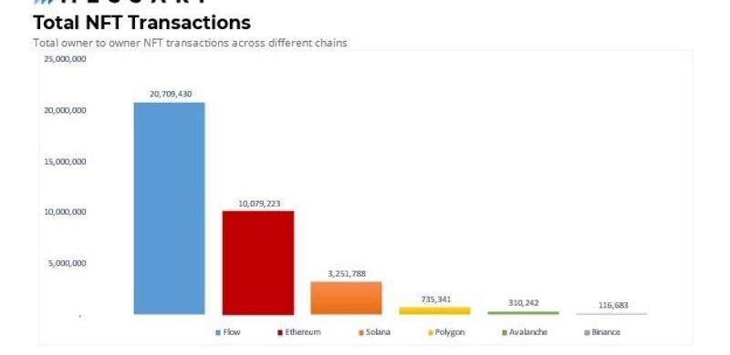 如前所述,目前Flow上已经部署了800多个智能合约,并且它尤其以吸引NFT项目而闻名。Flow链上的NFT二级市场交易量与其他L1链相比形成鲜明对比。Flow在NFT的C2C交易方面似乎一骑绝尘。此外,随着原生项目的用户持续参与,和新项目的大量涌现,Flow继续在NFT领域取得长足进步。