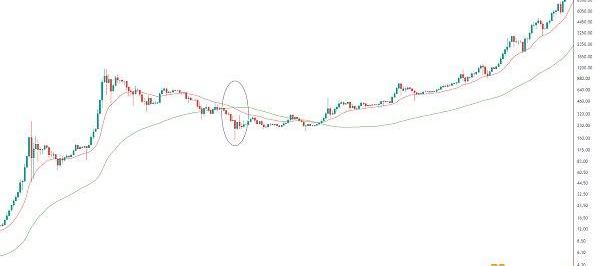 图中可以看到2013年牛市见顶后开启熊市,BTC一路震荡回落,最终见底在快慢两线死叉,后面便是长时间底部震荡,然后启动牛市行情。