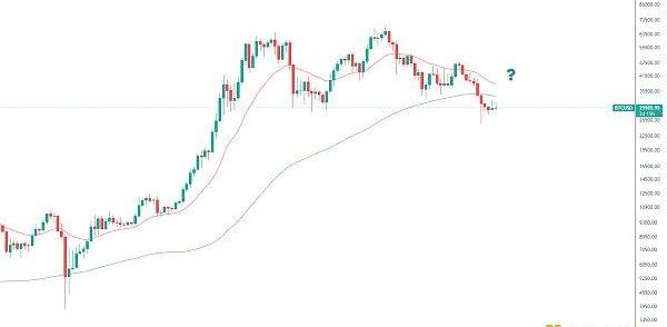 目前我们可以看到BTC自见顶69000后也是一路震荡回落,现在已破绿线支撑,破位后同样出现加速,然后插针回升横盘整理,上方红线依旧保持下滑姿态,除非BTC短时间内持续回升,否则两线死叉只是时间问题,而这可能是最终见底时间,目前破位,上方绿线压制目前点位33800美金,在未重新突破站稳前,反弹建议逢高减仓,谨防后续再次探底。