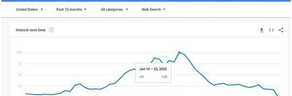 根据GoogleTrend的搜索数据显示,最近“NFT”的搜索热度已经从去年七月的高峰下降到了2021年1月之前的水平,侧面反映出人们对于NFT的关注热度正在急剧下降。