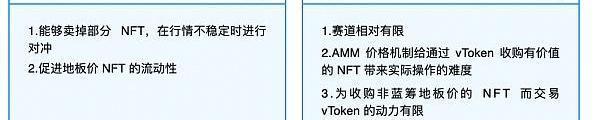NFTX是专注于地板款NFT赛道的项目,让使用者可以将地板款的NFT存入项目金库,并换成等值的vToken(ERC20),让其他人可以投资部分的地板款NFT。对于中高价位的同系列NFT,由于价值定位困难,且难以进行等值vToken的计算,NFTX决定舍弃这块市场,专注于做可以直接对标的NFT项目。