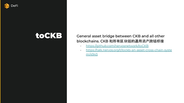 Jan:没有。我们的跨链方案 toCKB 是通用的跨链方案,toCKB 基本上可以实现 CKB 和其他任何链的跨链。也就是说,让 CKB 和币安链进行资产跨链是完全可行的。我们目前正在尝试对于各种链的跨链支持。