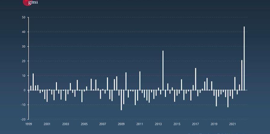 现在,大家都在关心美联储的下一步行动。他们已经提高了25个基点,但这还不够,他们还需要提高11倍。然而,其实债券市场已经为他们做到了这一点,所以我们并不需要中央银行。如今全世界范围内的资本成本都在上升,抵押贷款利率的不断上涨极大增加了人们的债务成本,所以也没人在乎美联储的基金利率了。