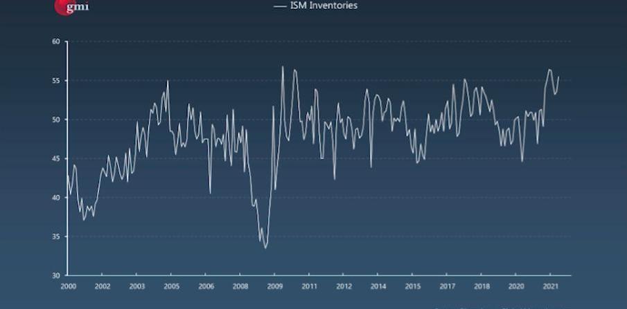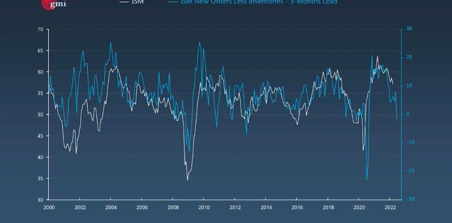 下一张是ISM库存图,可以看到库存水平一直保持在较高水平。如果需求放缓的话,就可以出售库存。它下面那张图显示的是ISM与ISM新订单减去库存的对比,这个指标也很有意义。从中我们可以看出,与新订单相比,库存水平太高了。随着时间的推移,我们将看到库存的清算,这表明ISM将低于50。现在,这种趋势还没有被扭转过来,可能还将持续下去。并且,我们也不确定我们是在走向经济衰退,还是正在走向增长冲击。