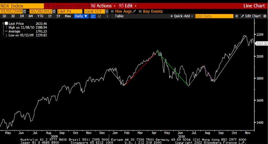 下图是2009年至2010年纳斯达克100指数的变化情况。2010年我们叫停了第一次量化宽松政策,于是市场纷纷抛售,股指出现了「W」形的变化。而当人们意识到央行将继续推行量化宽松时,股票经历了再一次的上涨。