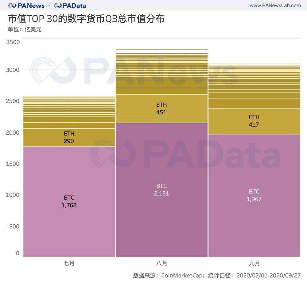 为展现在狂热的“农耕时代”中,各个数字货币的具体表现和市场新动向,PAData进行了本年度第三次TOP 30系列观察(TOP 30指市值排名前30的数字货币,下文简称TOP 30),观察期为7月1日至9月27日。根据分析,三季度TOP 30的币价平均上涨超47%,季度持币收益区间同比扩大46%,但总市值略有下滑,币价日均波动率已回升至7%以上,需警惕风险。YFI成三季度收益表现最佳的资产。