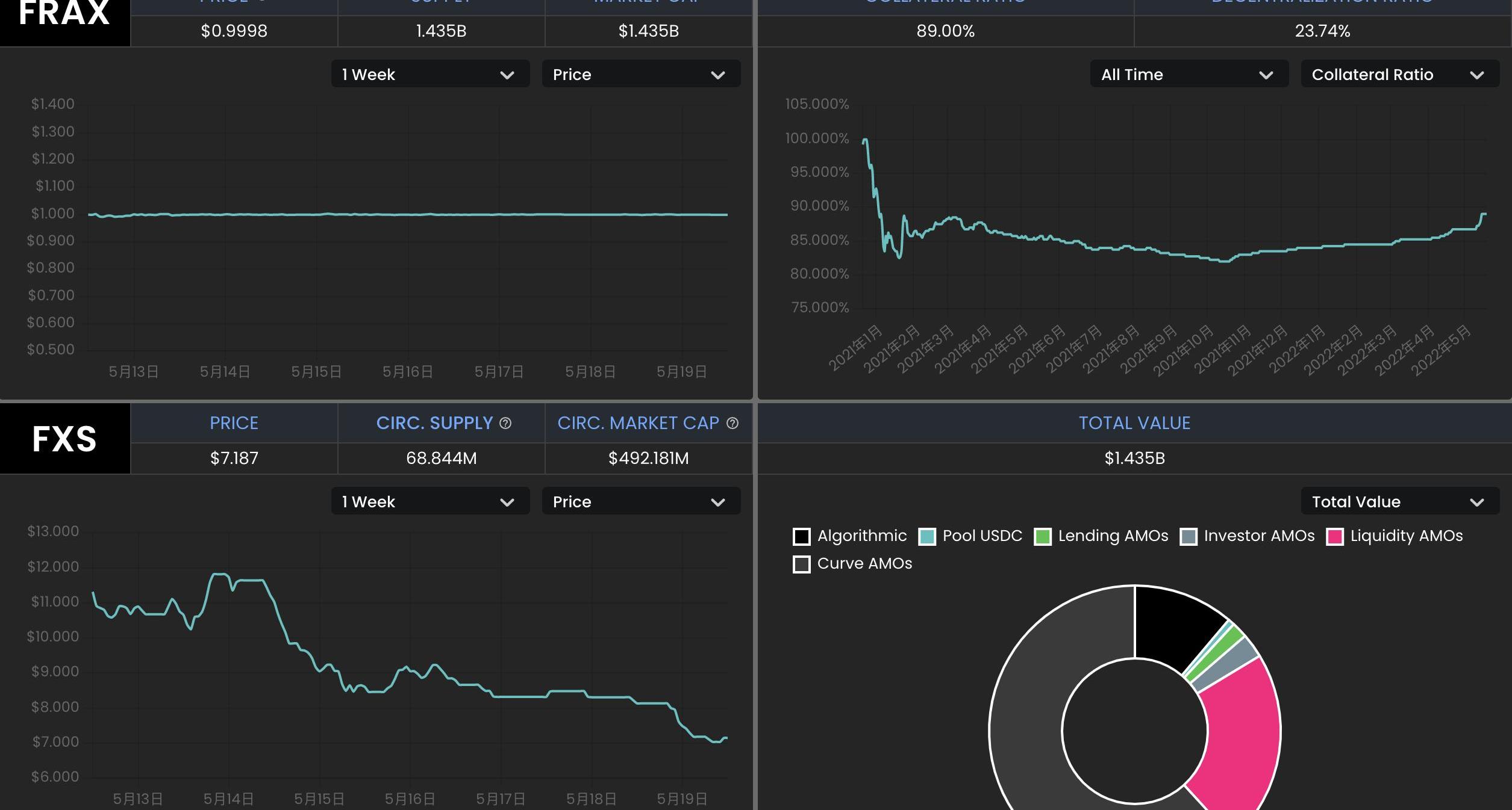 Frax是一种部分算法稳定币,铸造FRAX需要一部分的USDC和一部分FXS,协议允许用户用1美元的USDC+FXS铸造1FRAX,也允许销毁1FRAX赎回1美元的USDC+FXS。USDC的占比称为抵押率,FXS对应算法部分。若FRAX的需求高,算法部分的占比升高;若FRAX需求不足,算法部分的占比下降。从5月1日到现在,FRAX的流通量从27亿下降到14.9亿,降幅44.8%。