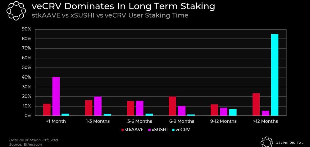 通过CRV一个细长的分配计划和veToken经济学的结合,已经能够激励一群非常粘稠的流动性提供者和代币持有者。这可以通过stkAAVE、xSUSHI和veCRV/Holdings之间的锁定时间来说明。