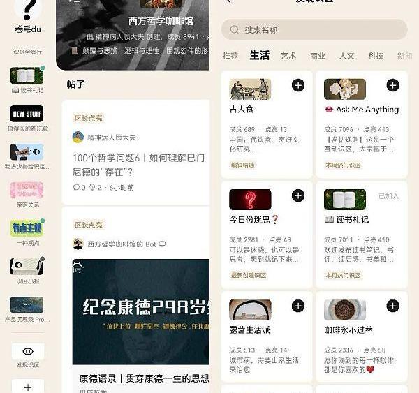 通过“识区”页的侧边栏导航,用户可以切换、搜索更多识区。目前生活、艺术、商业、人文等识区分类靠前,热门识区如“西方哲学咖啡馆”、“商业深一度”分别有9057和6326个成员。