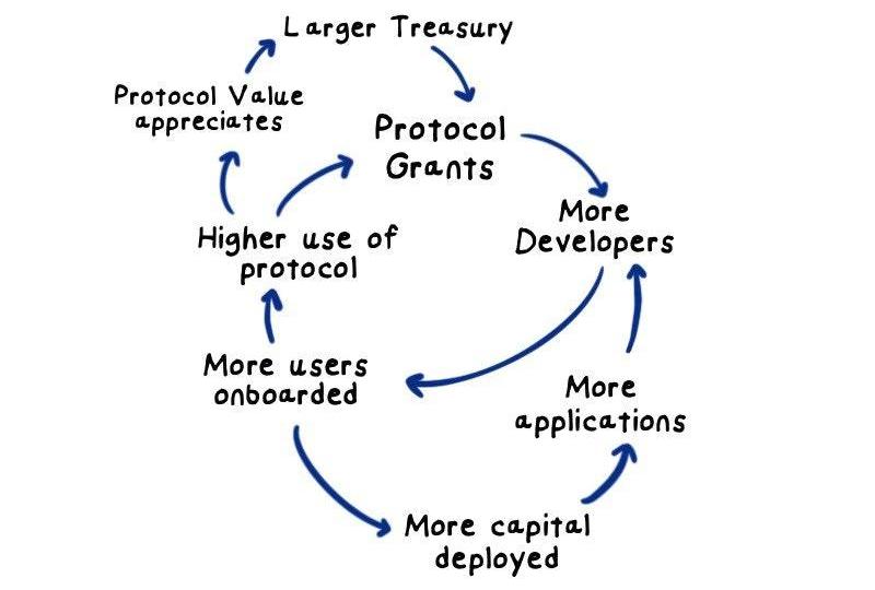 Web3目前还没有从政府投资中直接大规模受益,而是发放Grant资金的协议在向Web3注入资金。如果你把这些网络或协议看作是民族国家的未来,那么意义非凡。提供Grant资金的协议的主张是非常简单的。一个链上部署的应用程序越多,用户数量就越多,因此底层协议本身的使用率也就越高。用户可以登录到一个应用程序的链上,但一旦他们把自己的资产连接起来,他们就可以渗透到该生态中的不同Dapp中。这其中有什么联系呢?可以联想到Joelmongro在6年前的描述的胖协议理论: